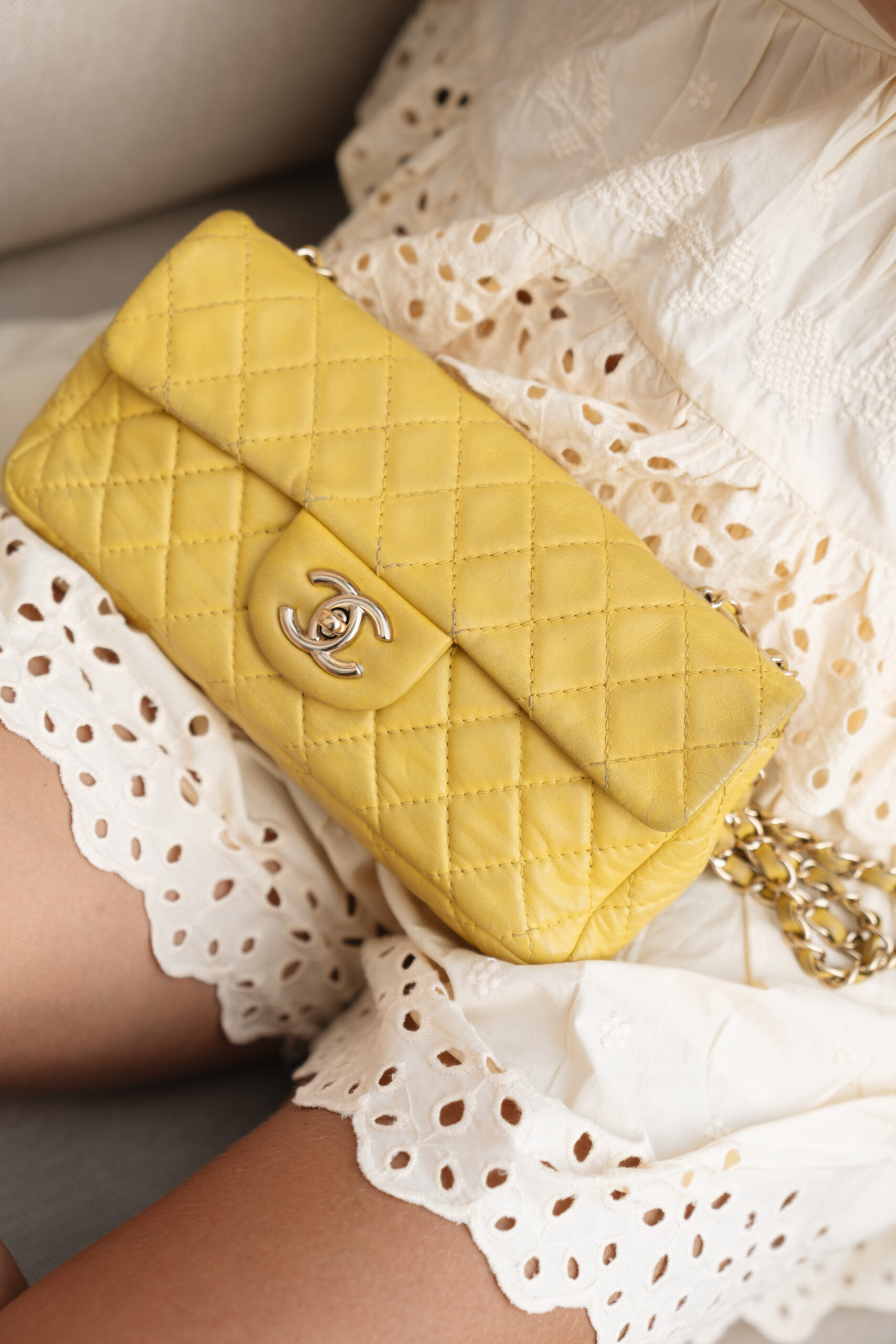 Super zeldzaam is deze fantastische gele Chanel Classic Flap Bag in de east west uitvoering. De classic flap is de meest iconische designer as ter wereld en deze uitvoering is net wat langwerpiger. Met deze eyecatcher van een Chanel tas steel jij de show op ieder feestje of huwelijk. De zonnige gele kleur zorgt voor kleur bij iedere outfit.