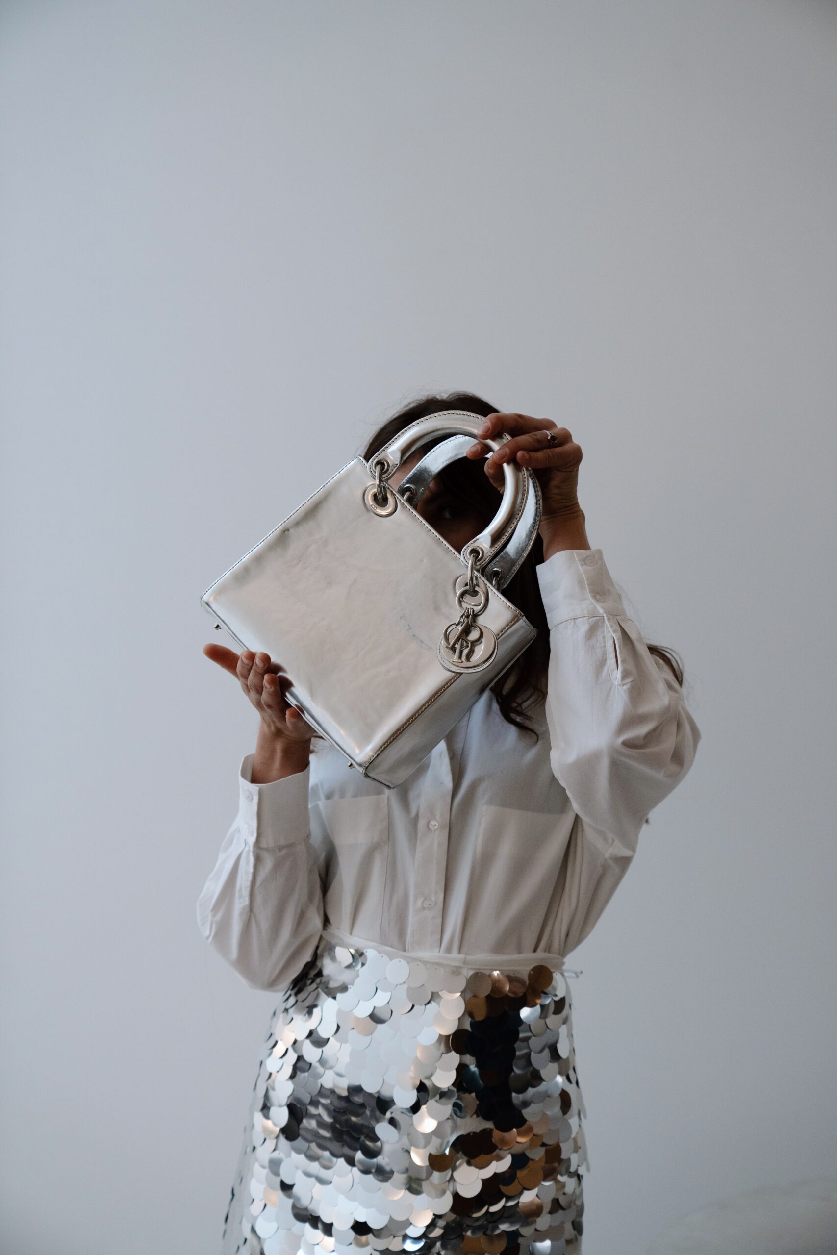 Deze prachtige tas van Dior, de Medium Lady Dior in metallic zilver kalfsleer komt uit de collectie van 2013. Het is echt een eyecatcher en deze Dior e tas is gemaakt van glad metallic zilver kalfsleer en heeft leren handgrepen aan de bovenkant met gepolijste zilveren schakels, een zilveren Dior-bedeltje en een optionele leren schouderriem.