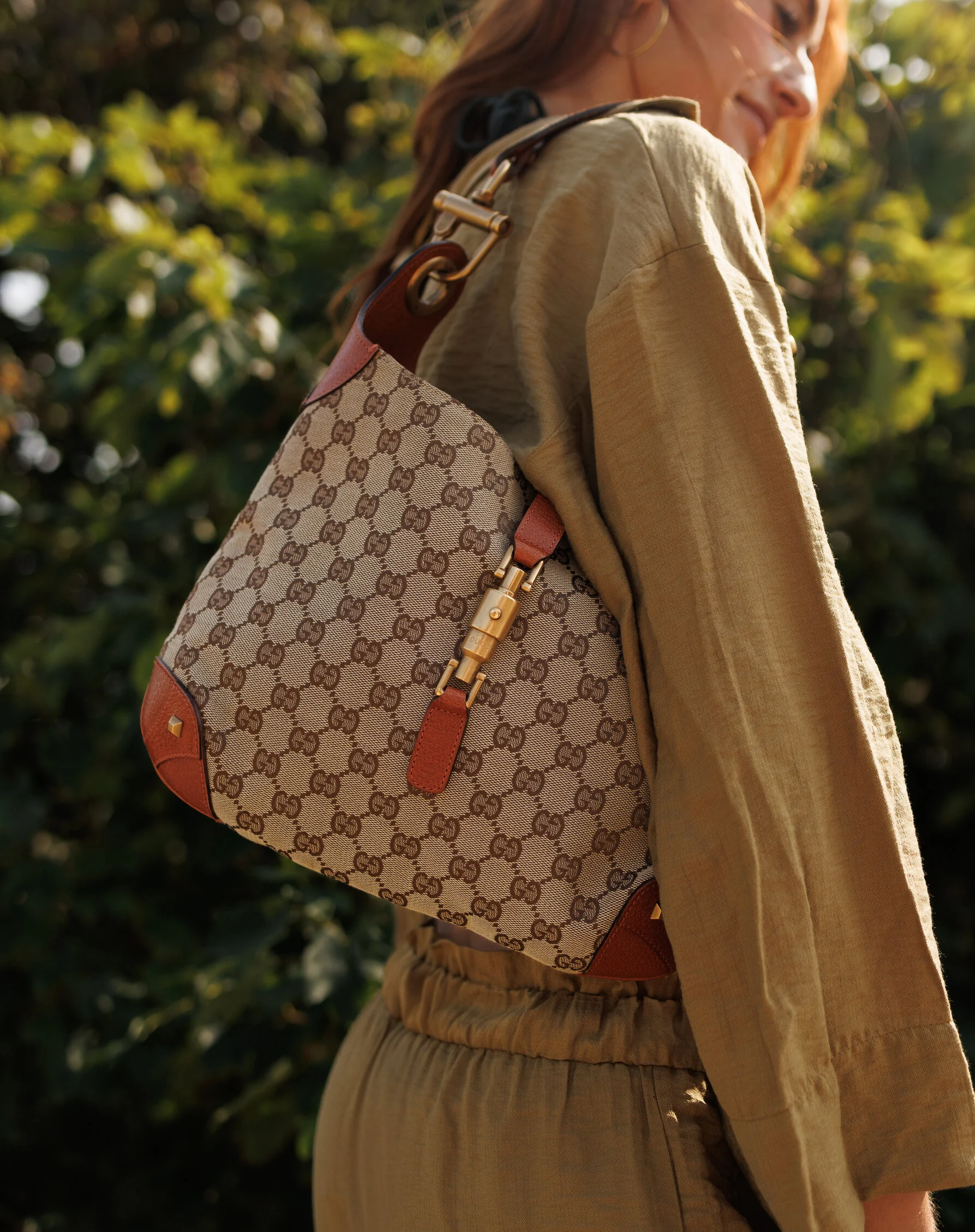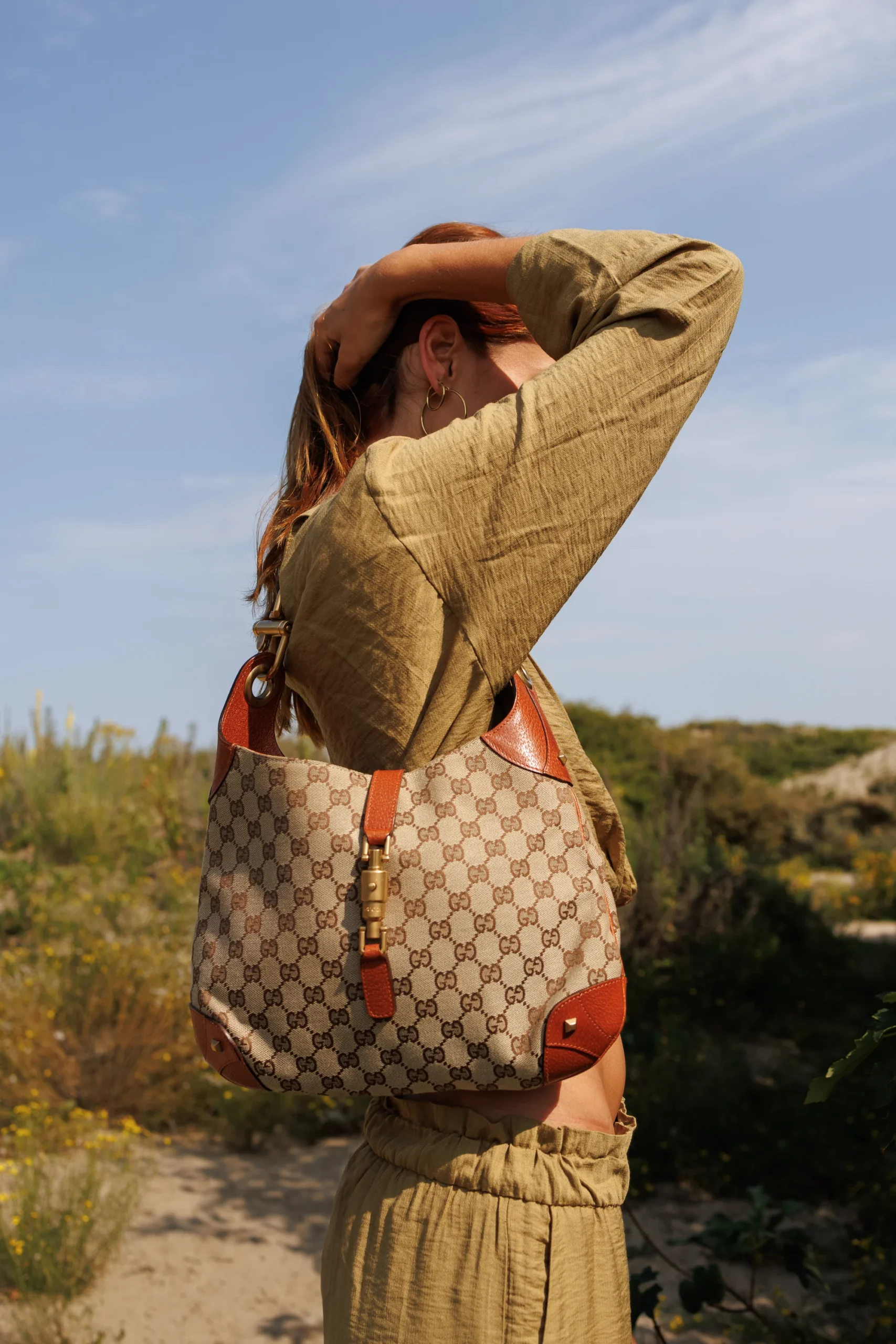 De Gucci jackie is een tas met een rijke geschiedenis en dankt zijn naam aan Jackie Kennedy, die vaak werd gespot met de tas tijdens haar tijd als First lady. De Gucci jackie tas heeft een halfronde vorm en de herkenbare goudkleurige bamboo-sluiting. Je draagt deze tas over je schouder. Deze prachtig uitvoering van de Gucci Jackie met monogram print maakt elke outfit af.