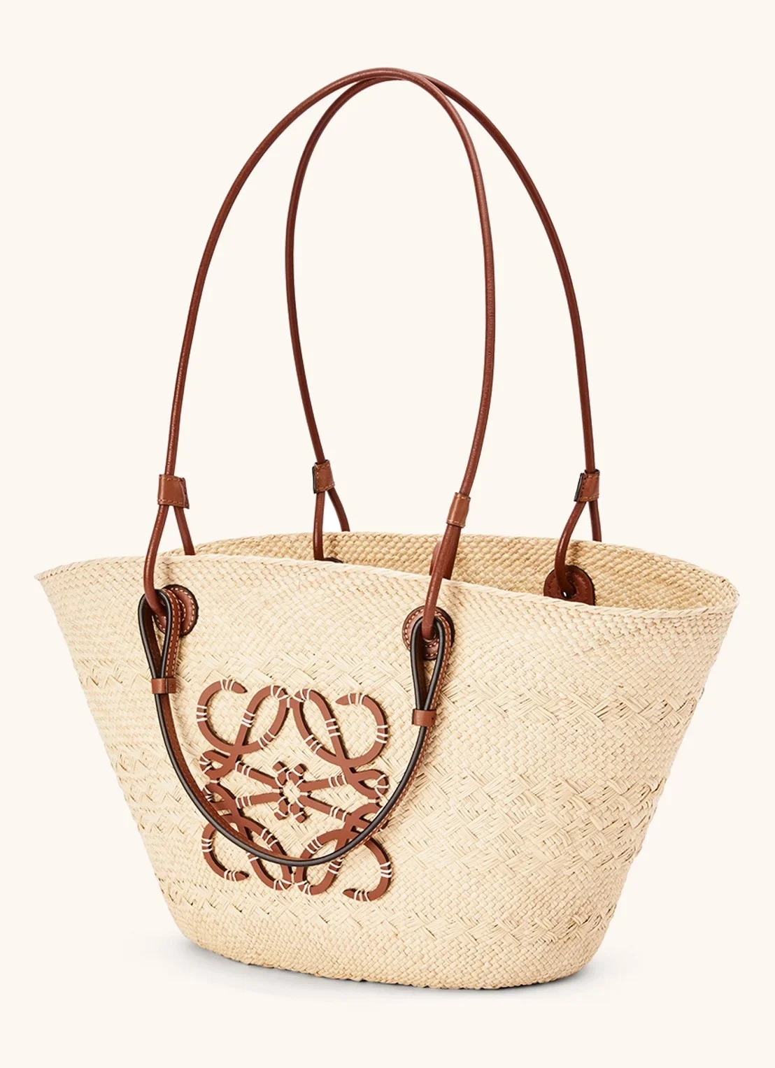 Meet de strandtas van dit seizoen; de mega populaire Loewe anagram basket bag. Dit is het medium formaat en deze tas heeft het herkenbare Loewe logo in cognackleurig leer. Deze Loewe anagram strandtas is handgeweven van Icara palmbladeren in Spanje. Door de lange en korte hengsels kun je de tas aan je arm of over je schouder dragen.